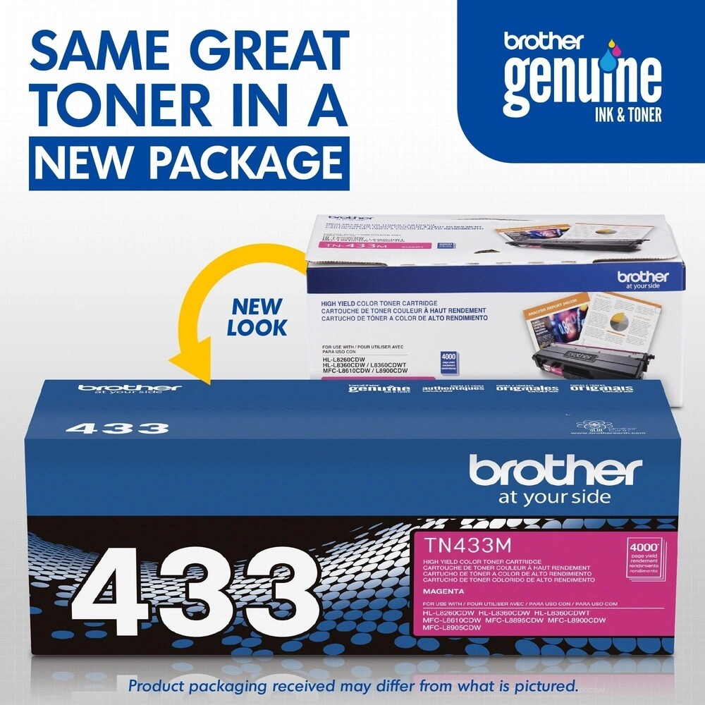 Toner original Brother TN433M magenta de alto rendimiento. Imprime hasta 4000 páginas con colores vibrantes y calidad profesional para tus documentos.